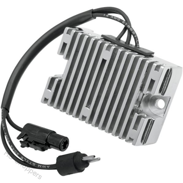 Chromový 12V regulátor dobíjení od firmy Cycle Electronic. Odpovídá OEM 74523-94.