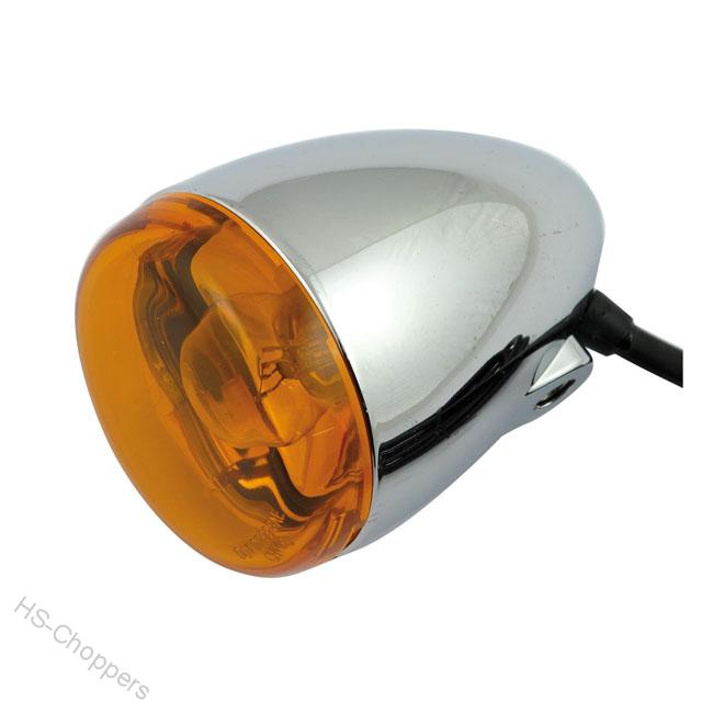 Chromové blinkry ve tvaru kulky, oranžové sklo s žárovkou s dvojitým vláknem.